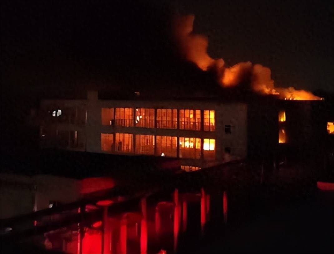 现场视频显示,疑似生产车间窜出明火和烟雾,在夜晚格外醒目。现场不断响起警报声。